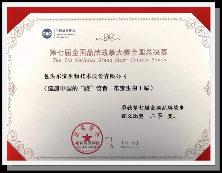 由中國質(zhì)量協(xié)會(huì )主辦、中國質(zhì)量協(xié)會(huì )品牌分會(huì )承辦的第七屆全國品牌故事大賽全國總決賽于2019年11月27-29日在北京舉行,本屆大賽以“品牌升級,世界共享”為主題,鼓勵各行業(yè)企業(yè)深入挖掘品牌內涵,以多視角、多形式講好品牌故事,積極塑造和傳播中國品牌形象。我公司由質(zhì)管部張紅飛撰寫(xiě)的品牌故事《健康中國的“膠”佼者--東寶生物王軍》獲得了全國品牌故事大賽征文二等獎的殊榮。