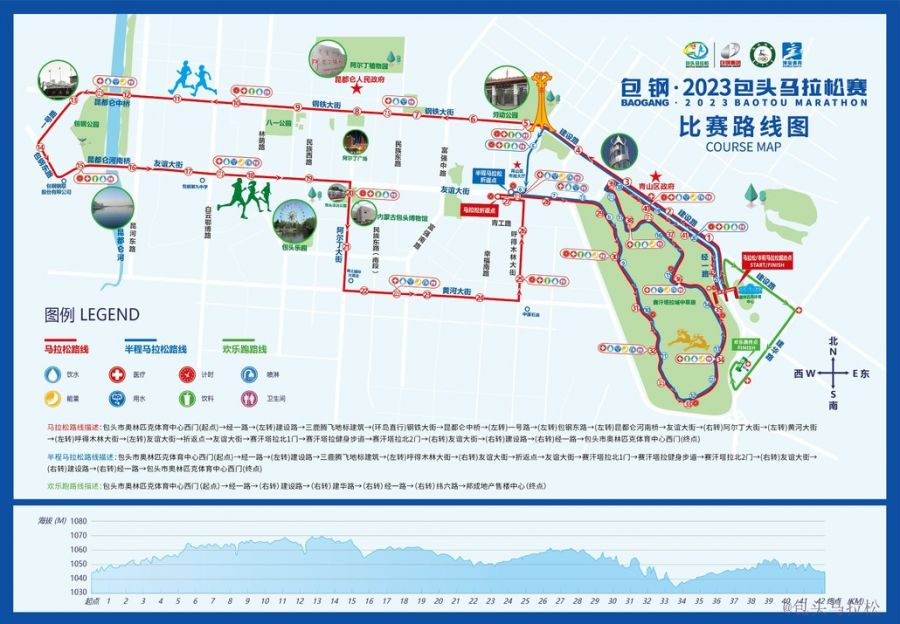 圓素提示:包頭馬拉松賽將于6月23日7點(diǎn)30分開(kāi)跑,所有參賽選手領(lǐng)取物料時(shí)間為6月20日(周二)9:00 — 18:00、6月21日(周三)9:00 — 18:00、6月22日(周四)9:00 — 21:00,地點(diǎn)為包頭奧林匹克體育中心(北門(mén)),比賽路線(xiàn)圖如下: